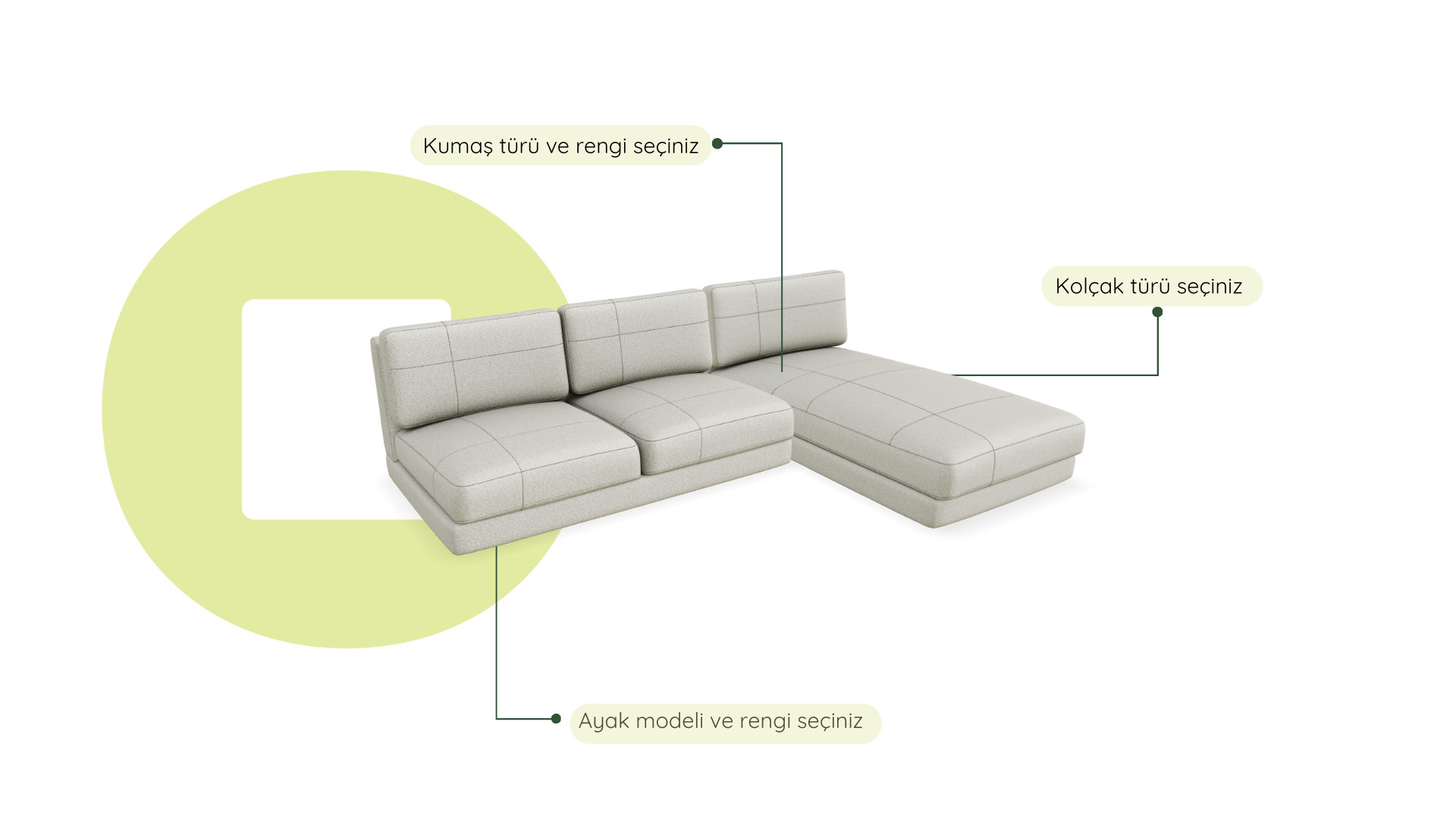Modül sistemimiz sayesinde, geniş seçenekler arasından dilediğiniz değişiklikleri yaparak hayalinizdeki koltuğu kendiniz tasarlayabilirsiniz. Farklı ölçülerdeki modüllerin yanı sıra; kolçak modelini, kumaş türü ve rengini, minder stilini, ayak modelini ve rengini odanıza ve zevkinize uygun şekilde, üstelik hiçbir ek ücret ödemeden kişiselleştirebilirsiniz.