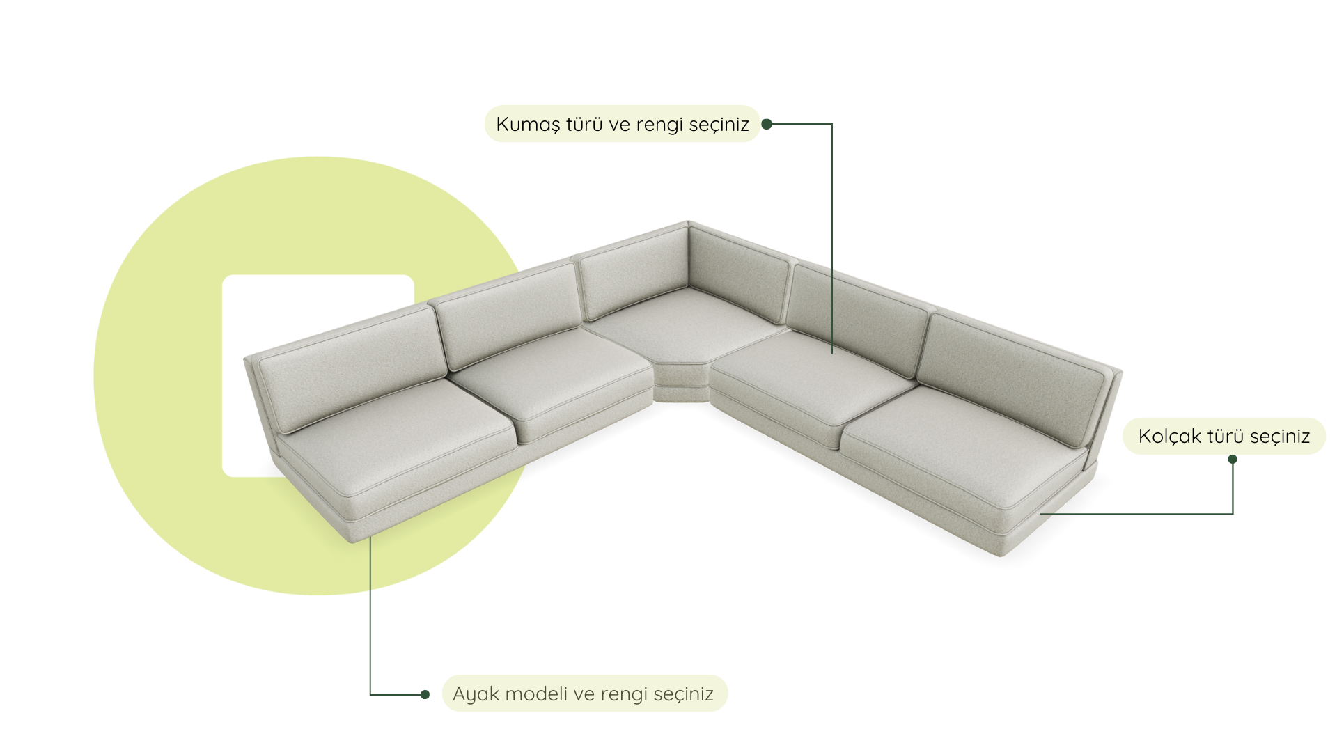 Modül sistemimiz sayesinde, geniş seçenekler arasından dilediğiniz değişiklikleri yaparak hayalinizdeki koltuğu kendiniz tasarlayabilirsiniz. Farklı ölçülerdeki modüllerin yanı sıra; kolçak modelini, kumaş türü ve rengini, minder stilini, ayak modelini ve rengini odanıza ve zevkinize uygun şekilde, üstelik hiçbir ek ücret ödemeden kişiselleştirebilirsiniz.