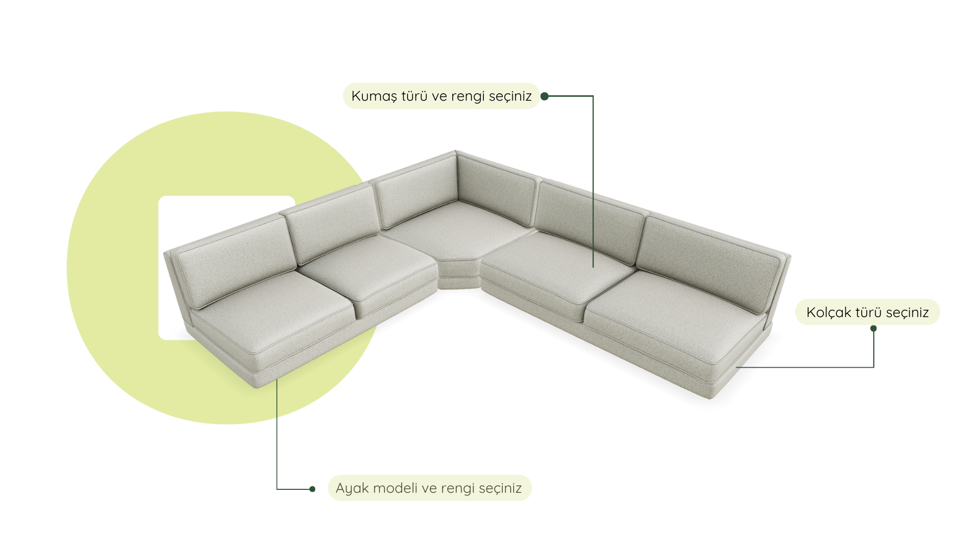 Modül sistemimiz sayesinde, geniş seçenekler arasından dilediğiniz değişiklikleri yaparak hayalinizdeki koltuğu kendiniz tasarlayabilirsiniz. Farklı ölçülerdeki modüllerin yanı sıra; kolçak modelini, kumaş türü ve rengini, minder stilini, ayak modelini ve rengini odanıza ve zevkinize uygun şekilde, üstelik hiçbir ek ücret ödemeden kişiselleştirebilirsiniz.